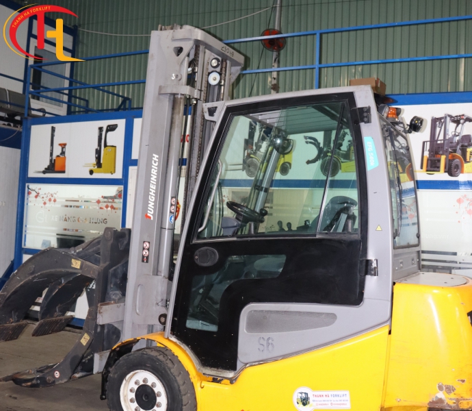 xe nâng điện ngồi lái của thương hiệu nổi tiếng Jungheinrich (Đức), nổi bật với tông màu vàng và xám. Điểm đặc biệt là nó được trang bị một bộ Kẹp Cuộn Giấy (Paper Roll Clamp) chuyên dụng, thay vì càng nâng tiêu chuẩn. Bộ kẹp lớn này được thiết kế để nắm giữ và vận chuyển các cuộn giấy tròn nặng một cách an toàn và hiệu quả. Đây là thiết bị lý tưởng phục vụ cho các nhà máy sản xuất giấy, in ấn hoặc bao bì.